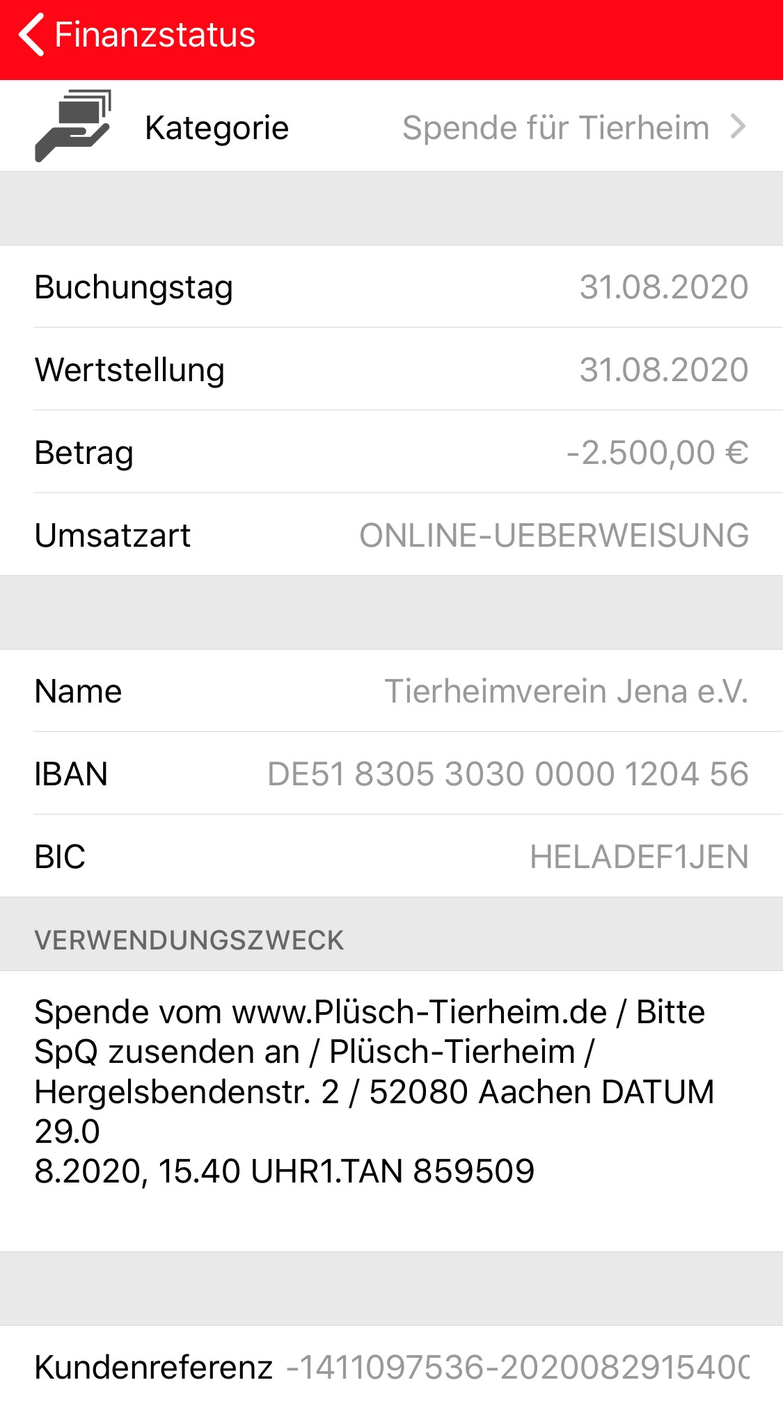 12.500€: Mega, wir haben gerade persönlich dem Tierheim in Jena 2500€ übergeben.