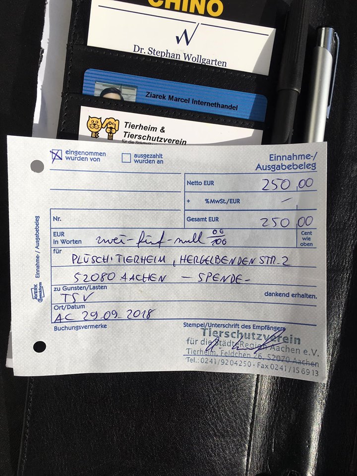Heute haben wir die ersten 250€ aus den verkauften Plüschtieren dem Tierheim Aachen übergeben. Ab jetzt fangen wir an für B wie Berlin zu sammlen.